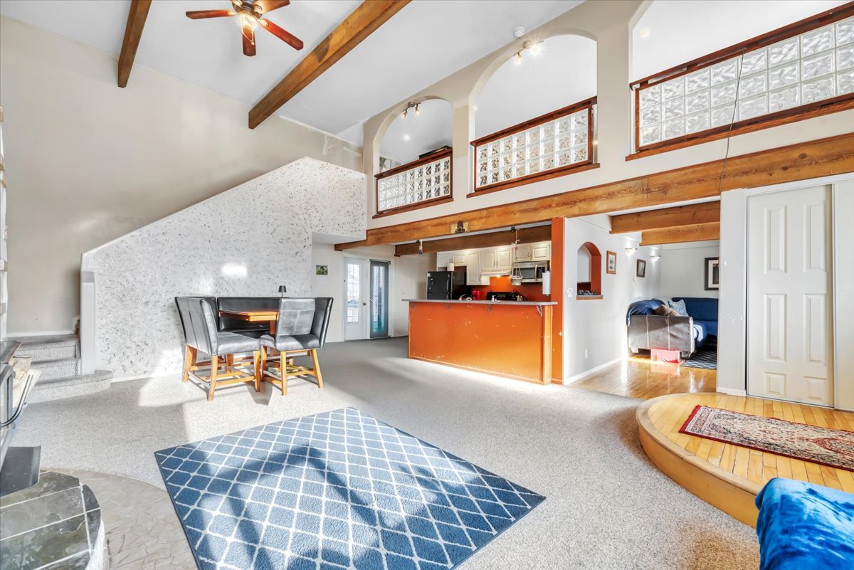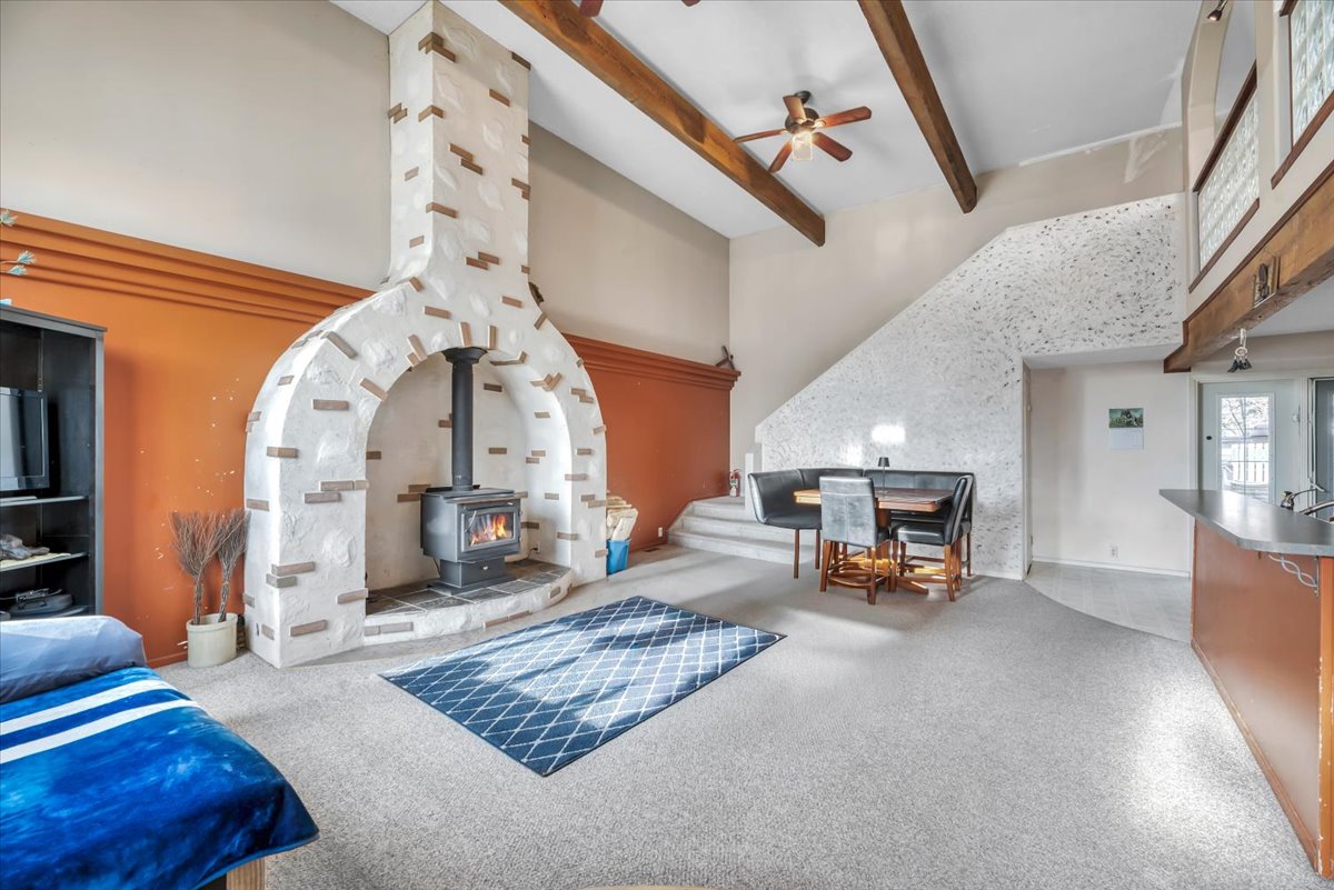 The Living Room is a warm, inviting space, perfect for family gatherings or cozy nights in. With vaulted ceilings and exposed wood beams, this room feels expansive and airy. The custom wood-burning fireplace serves as the room’s focal point, offering a welcoming atmosphere during the cooler months.
